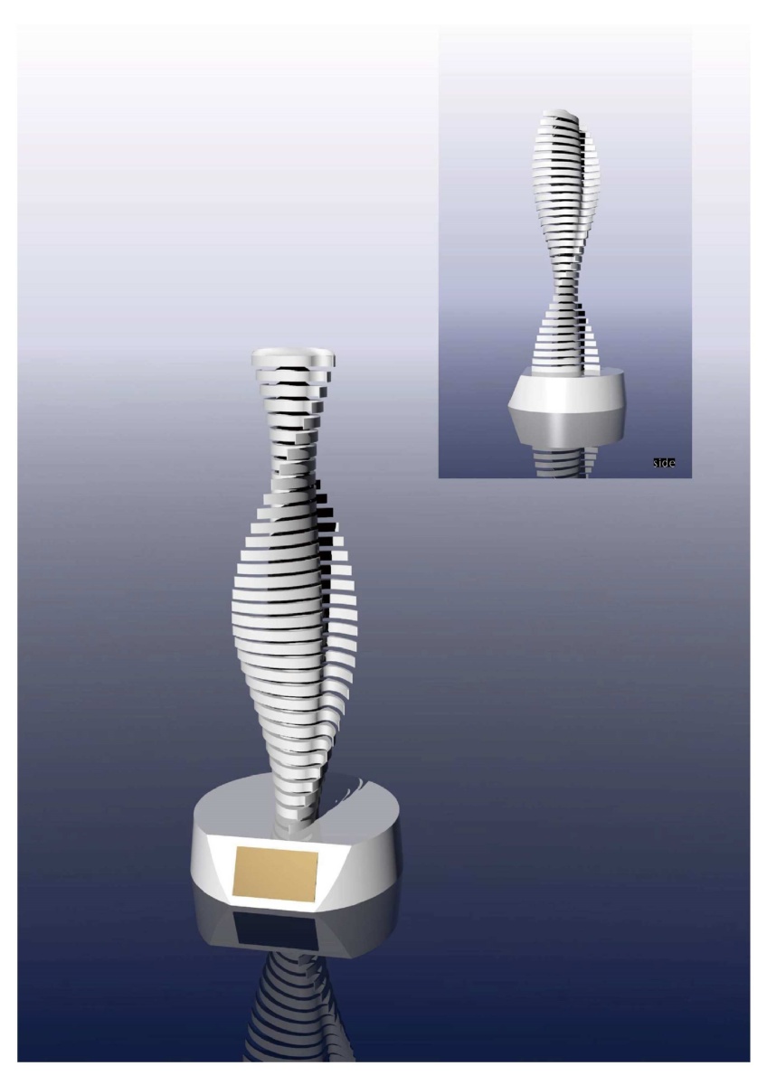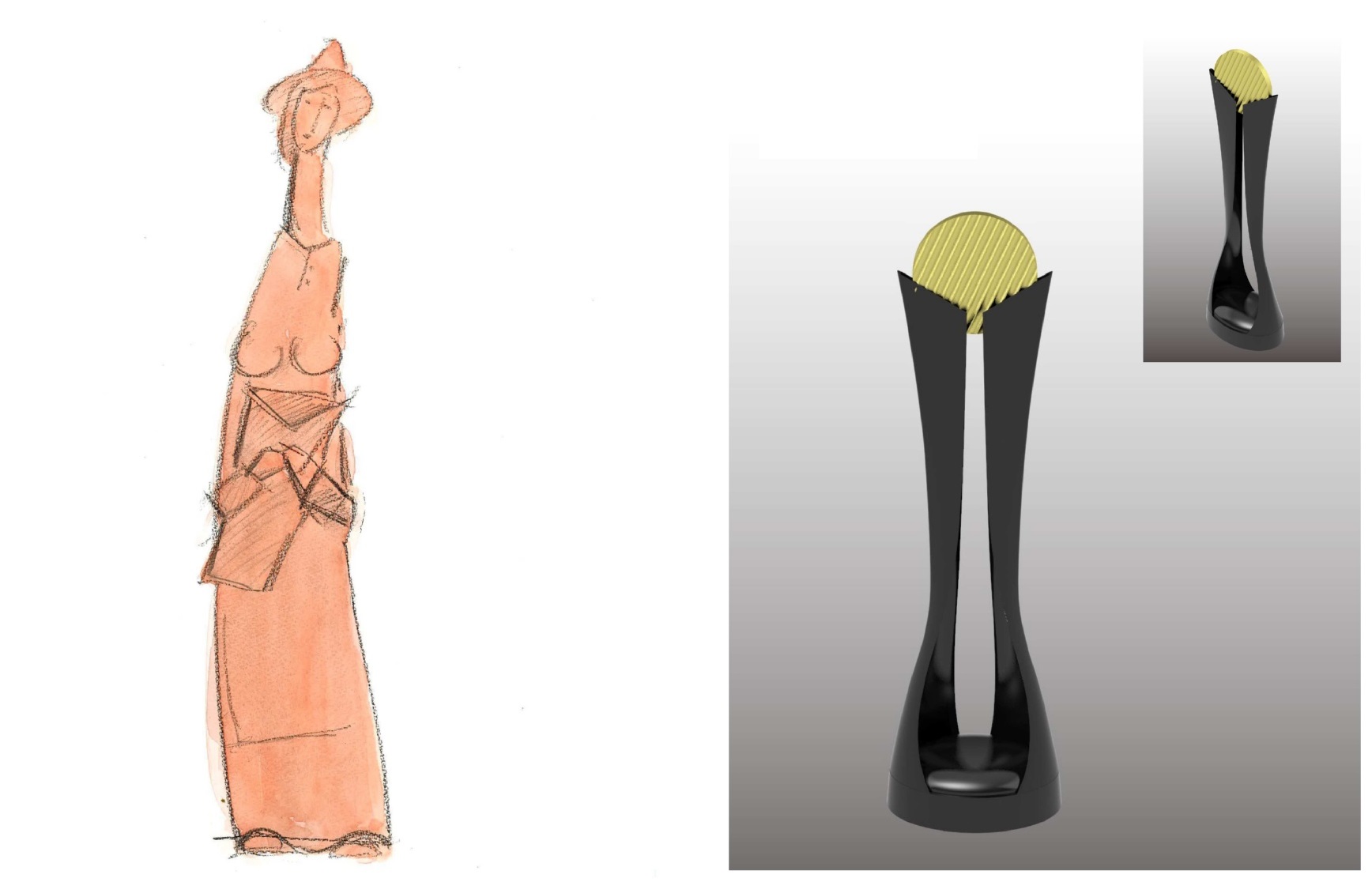 一つの形を数段にも重ねて、ねじることで光と影をまとい多様性ある姿を見せることができます。日本代表の女性が世界へ羽ばたく為にコンセプトを込めました。